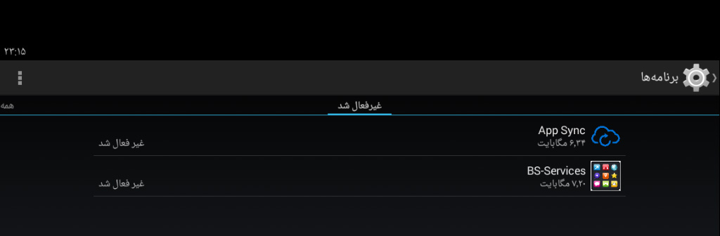 از قسمت برنامه های bluestacks به بخش ‘غیر فعال شد’ رفته و مثل عکس زیر ببینید این ۲ برنامه با موفقیت غیر فعال شدند یا نه؟