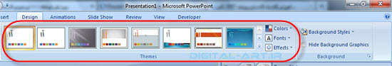 برای اضافه کردن یک پوسته (تم) به ارایه ابتدا از سربرگ Design به کادر گروه Themes مراجعه نمایید.