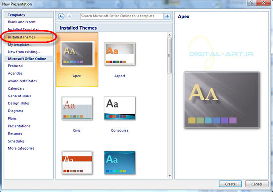 Installed Template : با انتخاب این گزینه، الگوهای زیر مجموعه آن نمایش داده خواهند شد که این الگوها ی نصب شده توسط برنامه پاورپوینت میباشند و شما بنا به نیاز خود میتوانید از الگوی متناسب استفاده نمایید.